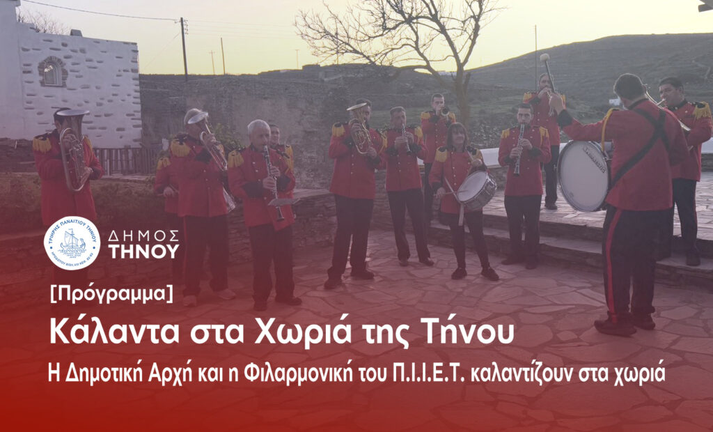 Ο Δήμος Τήνου, σε συνεργασία με τη Φιλαρμονική του Π.Ι.Ι.Ε.Τ., φέρνει τα χριστουγεννιάτικα κάλαντα και τη γιορτινή ατμόσφαιρα στα χωριά του νησιού μας. Οι μελωδίες της Φιλαρμονικής γεμίζουν χαρά, ελπίδα και ζωντάνια, αναδεικνύοντας την ομορφιά και τη ζεστασιά της όμορφη ενδοχώρα μας.