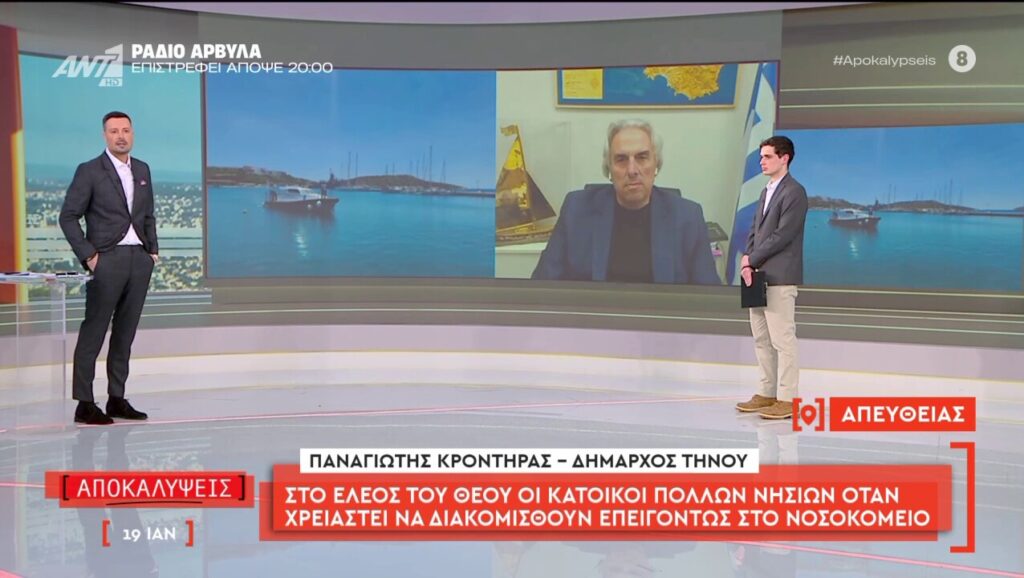 Σε μια δυναμική παρέμβαση στην εκπομπή «Αποκαλύψεις» με τον Πέτρο Κουσουλό στον τηλεοπτικό σταθμό ΑΝΤ1, προχώρησε σήμερα ο Δήμαρχος Τήνου, Παναγιώτης Κροντηράς, υψώνοντας για ακόμη μια φορά τη φωνή του ενάντια στις σοβαρές ελλείψεις ιατρικού προσωπικού που ταλανίζουν το νησί