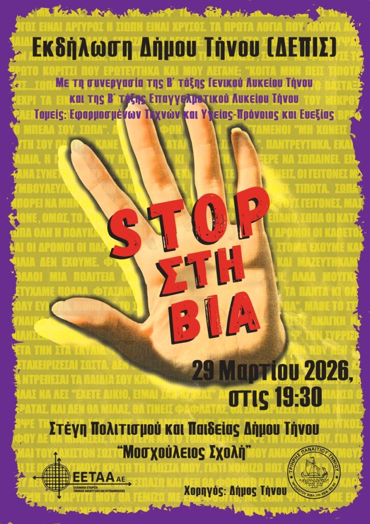 Η Δημοτική Επιτροπή Ισότητας του Δήμου Τήνου (ΔΕΠΙΣ), διοργανώνει εκδήλωση με θέμα τη βία, σε συνεργασία με μαθητές της Β’ Τάξης των Λυκείων Τήνου, την Κυριακή, 29 Μαρτίου, 19:30 στην Στέγη Πολιτισμού και Παιδείας Δήμου Τήνου “Μοσχούλειος Σχολή”. Η πρωτοβουλία αυτή στοχεύει στην ανάδειξη της φωνής των νέων και στην ευαισθητοποίηση της τοπικής κοινωνίας γύρω από ένα κρίσιμο κοινωνικό ζήτημα.