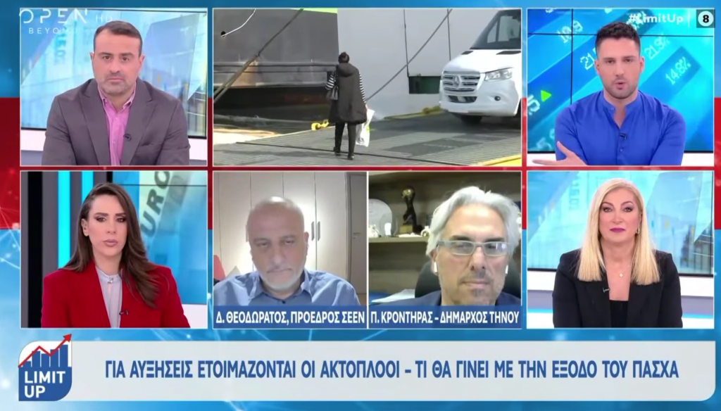 Στο κανάλι OPEN και στην εκπομπή Limit Up με τους Γιάννη Φώσκολο και Αντώνη Κρητικό, ο Δήμαρχος Τήνου Παναγιώτης Κροντηράς εξέφρασε την έντονη αντίθεσή του σε νέες αυξήσεις στα ακτοπλοϊκά εισιτήρια.