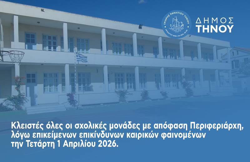 Ο Δήμος Τήνου ενημερώνει τους πολίτες του ότι, σύμφωνα με το Έκτακτο Δελτίο Επικίνδυνων Καιρικών Φαινομένων της Εθνικής Μετεωρολογικής Υπηρεσίας (ΕΜΥ) και την ανακοίνωση της Αυτοτελούς Διεύθυνσης Πολιτικής Προστασίας & Κλιματικής Κρίσης της Περιφέρειας Νοτίου Αιγαίου, αναμένεται επιδείνωση των καιρικών συνθηκών από την Τετάρτη 1 Απριλίου 2026 έως και την Πέμπτη 2 Απριλίου 2026.