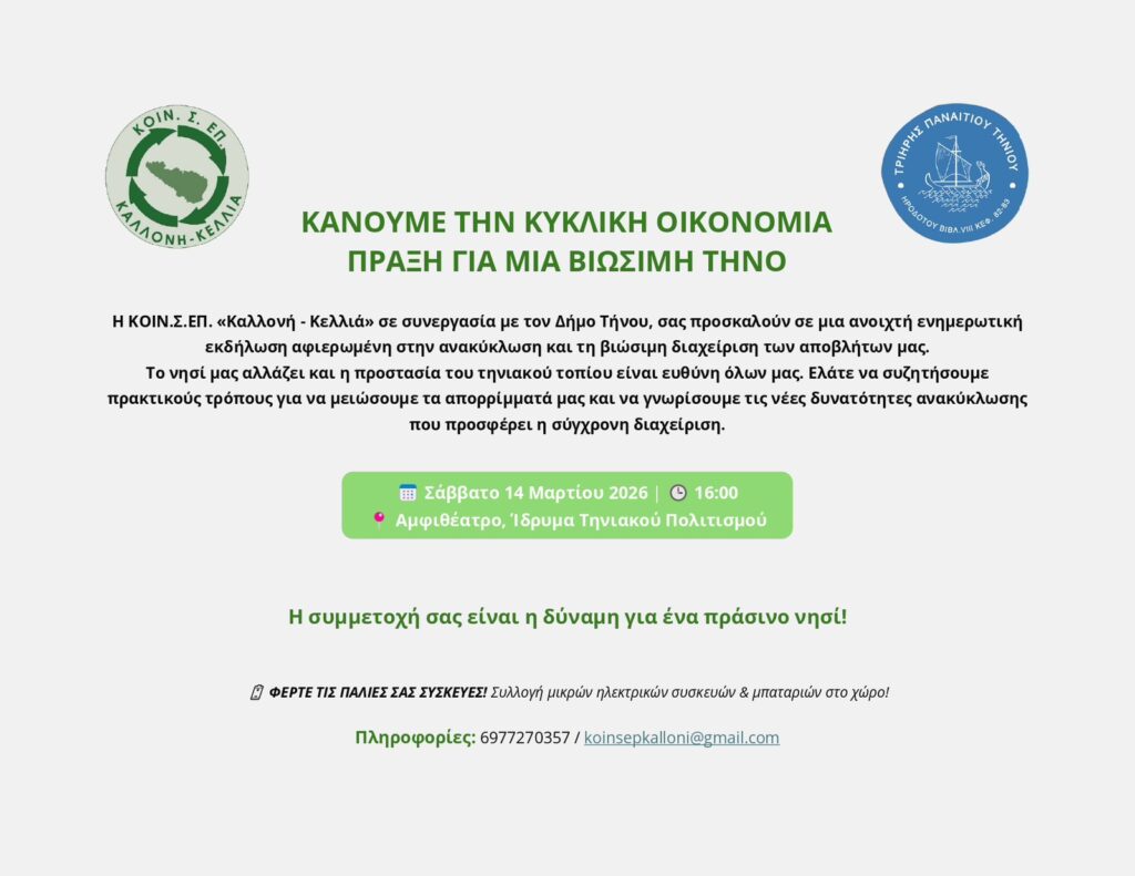Η ΚΟΙΝ.Σ.ΕΠ. «Καλλονή – Κελλιά», σε συνεργασία με τον Δήμο Τήνου, διοργανώνουν ανοιχτή ενημερωτική εκδήλωση για την κυκλική οικονομία, την ανακύκλωση και τη βιώσιμη διαχείριση αποβλήτων, το Σάββατο 14 Μαρτίου 2026 στις 16:00, στην κεντρική συνεδριακή αίθουσα του Ιδρύματος Τηνιακού Πολιτισμού (Ι.ΤΗ.Π.).
