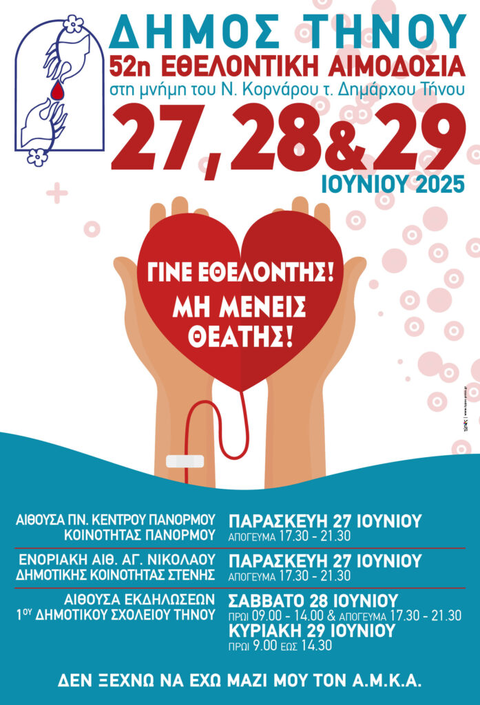 Ο Δήμος Τήνου διοργανώνει την 52η Εθελοντική Αιμοδοσία στην μνήμη του Ν. Κορνάρου – τ. Δημάρχου Τήνου.