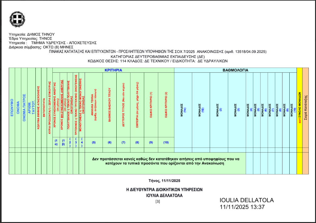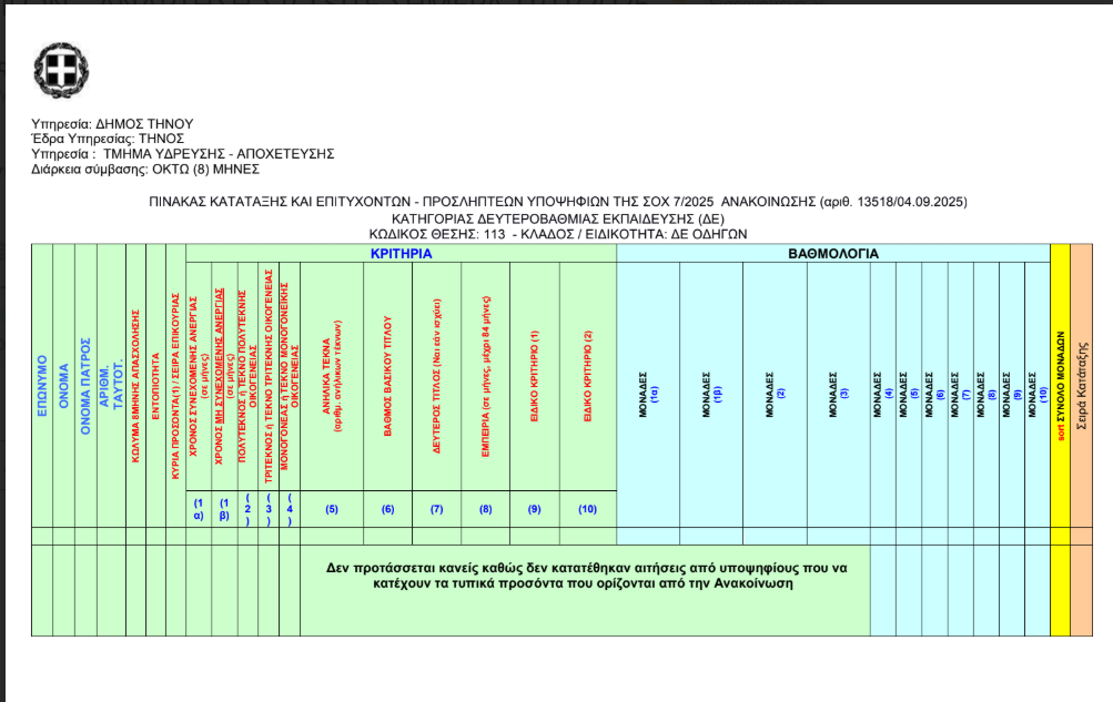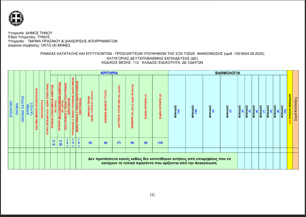 Δήμος Τήνου: Αποτελέσματα Προσλήψεων Προσωπικού Προκήρυξης ΣΟΧ 7/2025 Home / Δελτία Τύπου – Νέα / ΟΡΙΣΤΙΚΟΣ ΠΙΝΑΚΑΣ ΑΠΟΡΡΙΠΤΕΩΝ ΣΟΧ 7-2025Λήψη ΠΙΝΑΚΕΣ ΠΡΟΣΛΗΠΤΕΩΝ ΣΟΧ 7-2025 ΑΝΑΚΟΙΝΩΣΗΣ ΔΗΜΟΥ ΤΗΝΟΥΛήψη