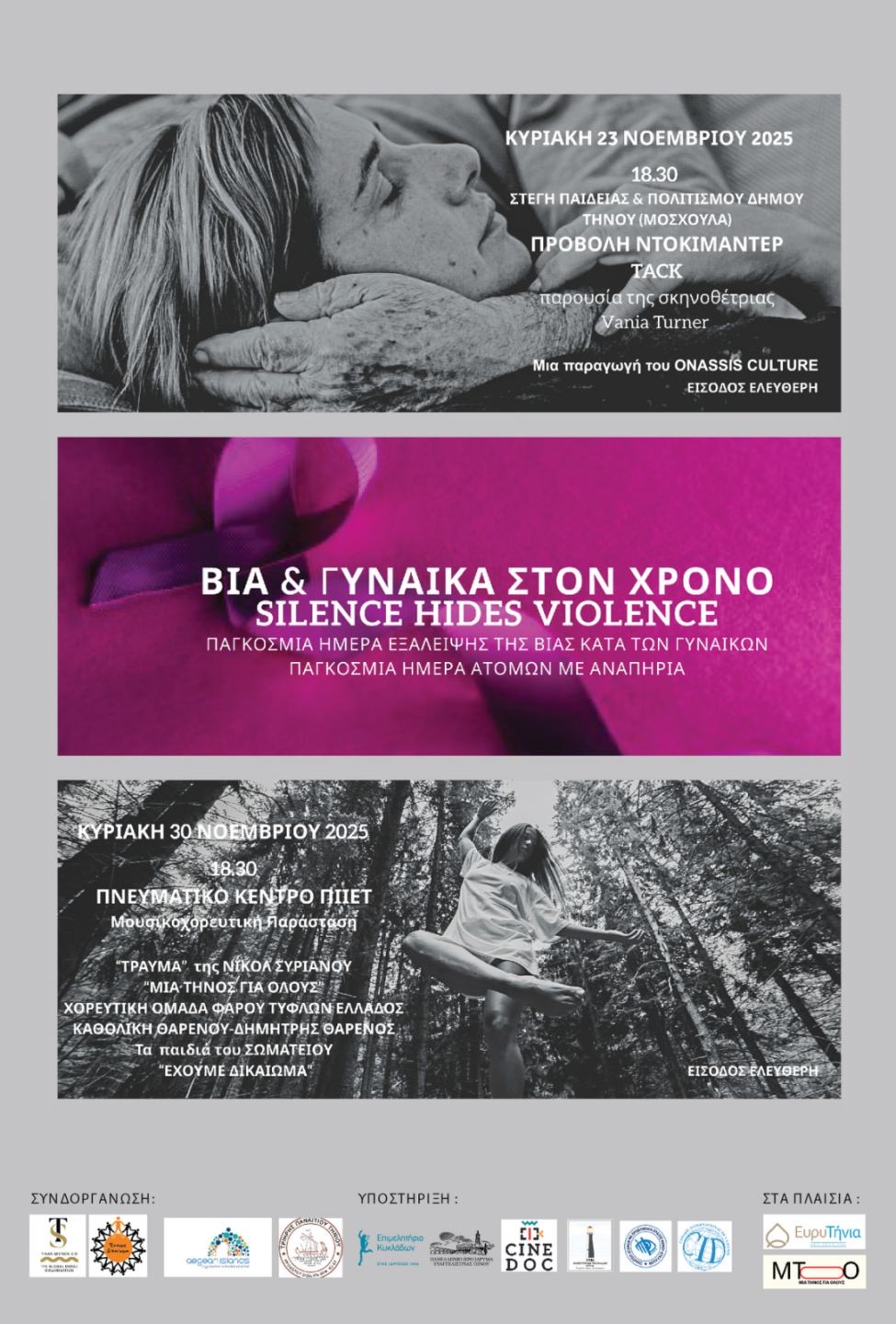 Δύο παγκόσμιες  ημέρες, Παγκόσμια Ημέρα Εξάλειψης της  Βίας κατά των Γυναικών και  Παγκόσμια ημέρα Ατόμων με Αναπηρία,  2 Σύλλογοι, το Τμήμα Τήνου Διεθνούς Συμβουλίου Χορού & το Σωματείο «Έχουμε Δικαίωμα», ο Δήμος Τήνου,   η Περιφέρεια Νοτίου Αιγαίου, Περιφερειακή  Ενότητα Τήνου, το Σωματείο Αρωγή ατόμων με  προβλήματα  Όρασης του Νομού Κυκλάδων, ενώνουν τις δυνάμεις τους σε μία σειρά δράσεων για τη Βία και την Αναπηρία, θέλοντας εφεξής οι συγκεκριμένες παγκόσμιες ημέρες  να λειτουργούν ως σταθμός απολογισμού  για το νησί μας. Η Γυναίκα στο Χρόνο και το  Μία Τήνο για Όλους, συλλειτουργούν και συνδέονται.