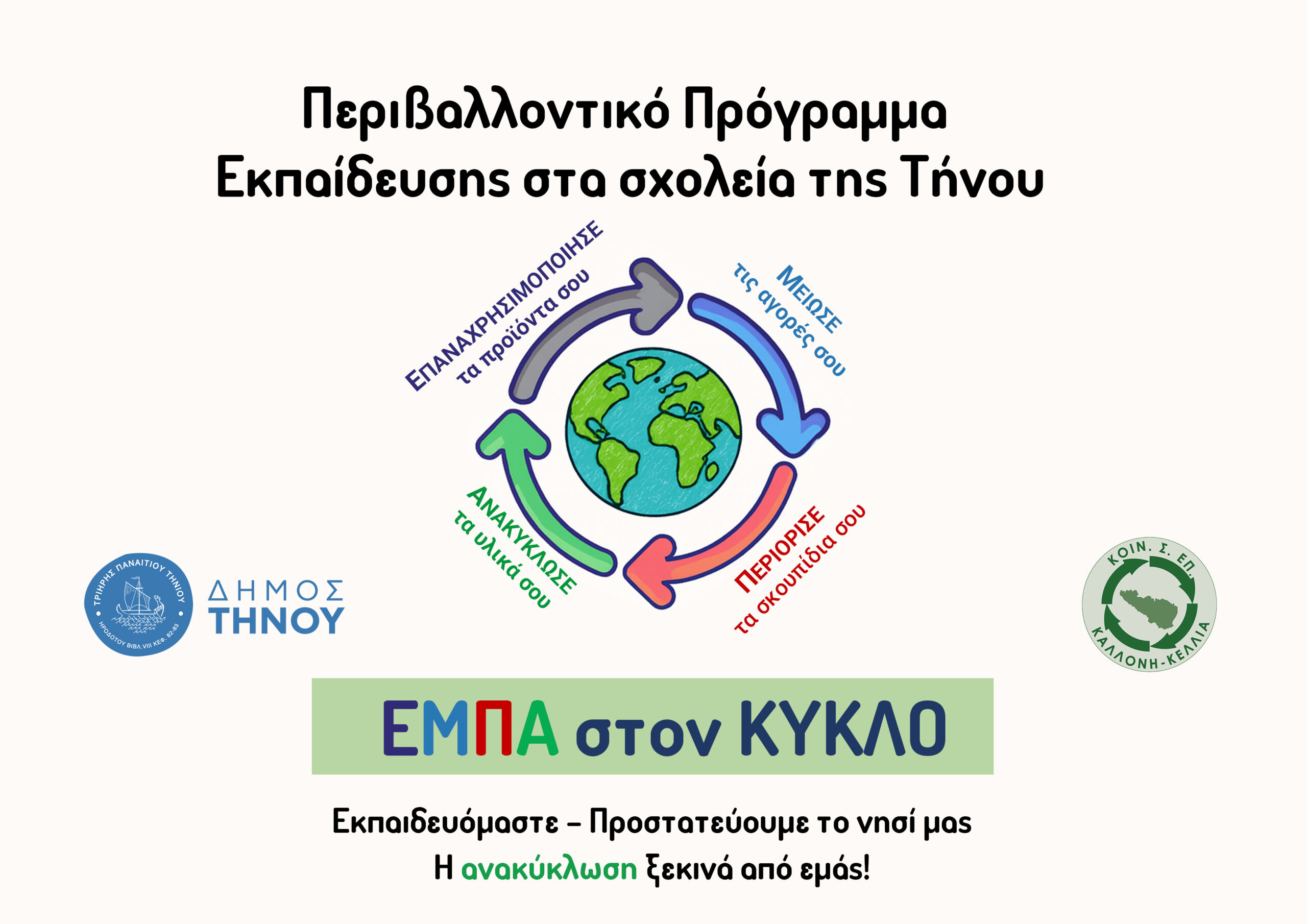 Με αφορμή την Ευρωπαϊκή Εβδομάδα Μείωσης Αποβλήτων (EWWR 2025), η Κοιν.Σ.Επ. Καλλονή–Κελλιά, με την υποστήριξη του Δήμου Τήνου, υλοποιεί το περιβαλλοντικό πρόγραμμα Κυκλικής Οικονομίας «ΕΜΠΑ στον ΚΥΚΛΟ» σε σχολεία Πρωτοβάθμιας και Δευτεροβάθμιας Εκπαίδευσης του νησιού.