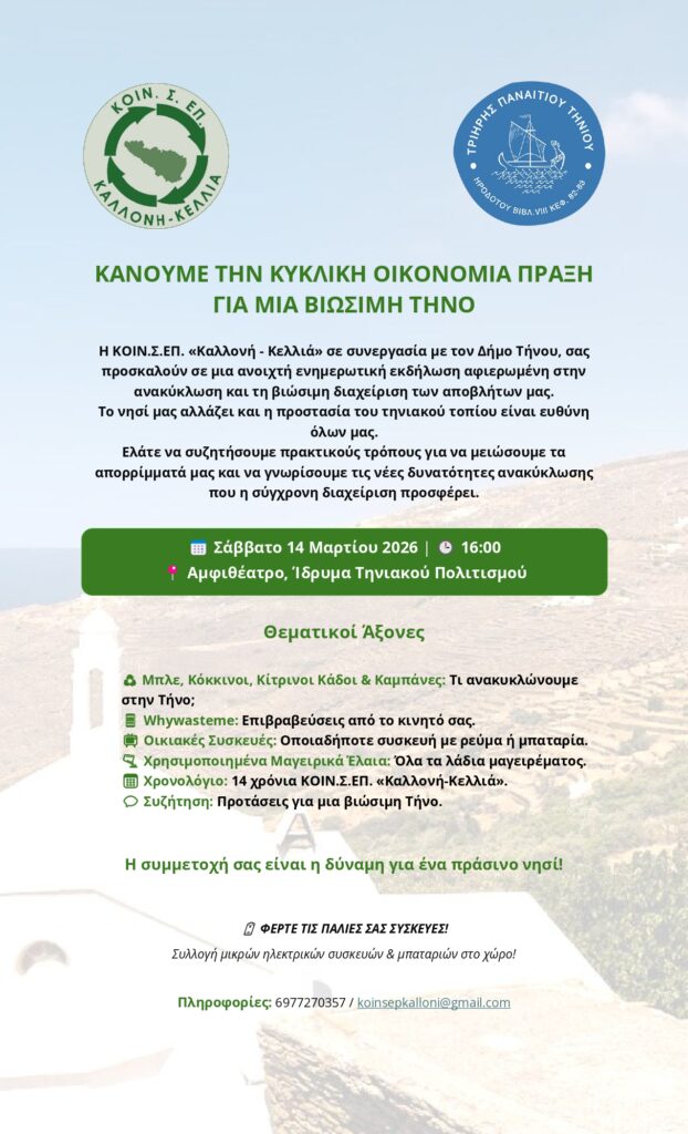 Η ΚΟΙΝ.Σ.ΕΠ. «Καλλονή – Κελλιά», σε συνεργασία με τον Δήμο Τήνου, διοργανώνουν ανοιχτή ενημερωτική εκδήλωση για την κυκλική οικονομία, την ανακύκλωση και τη βιώσιμη διαχείριση αποβλήτων, το Σάββατο 14 Μαρτίου 2026 στις 16:00, στην κεντρική συνεδριακή αίθουσα του Ιδρύματος Τηνιακού Πολιτισμού (Ι.ΤΗ.Π.).