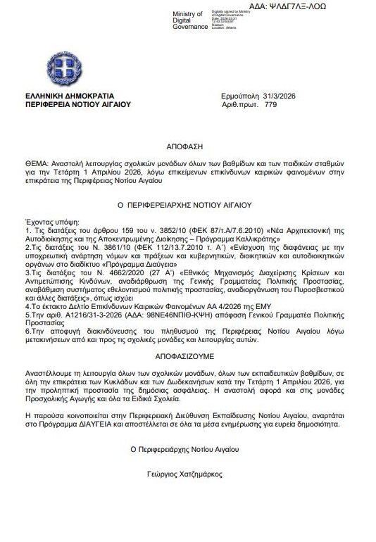 Αναστέλλουμε τη λειτουργία όλων των σχολικών μονάδων, όλων των εκπαιδευτικών βαθμίδων, σε όλη την επικράτεια των Κυκλάδων και των Δωδεκανήσων κατά την Τετάρτη 1 Απριλίου 2026, για την προληπτική προστασία της δημόσιας ασφάλειας. Η αναστολή αφορά και στις μονάδες Προσχολικής Αγωγής και όλα τα Ειδικά Σχολεία.