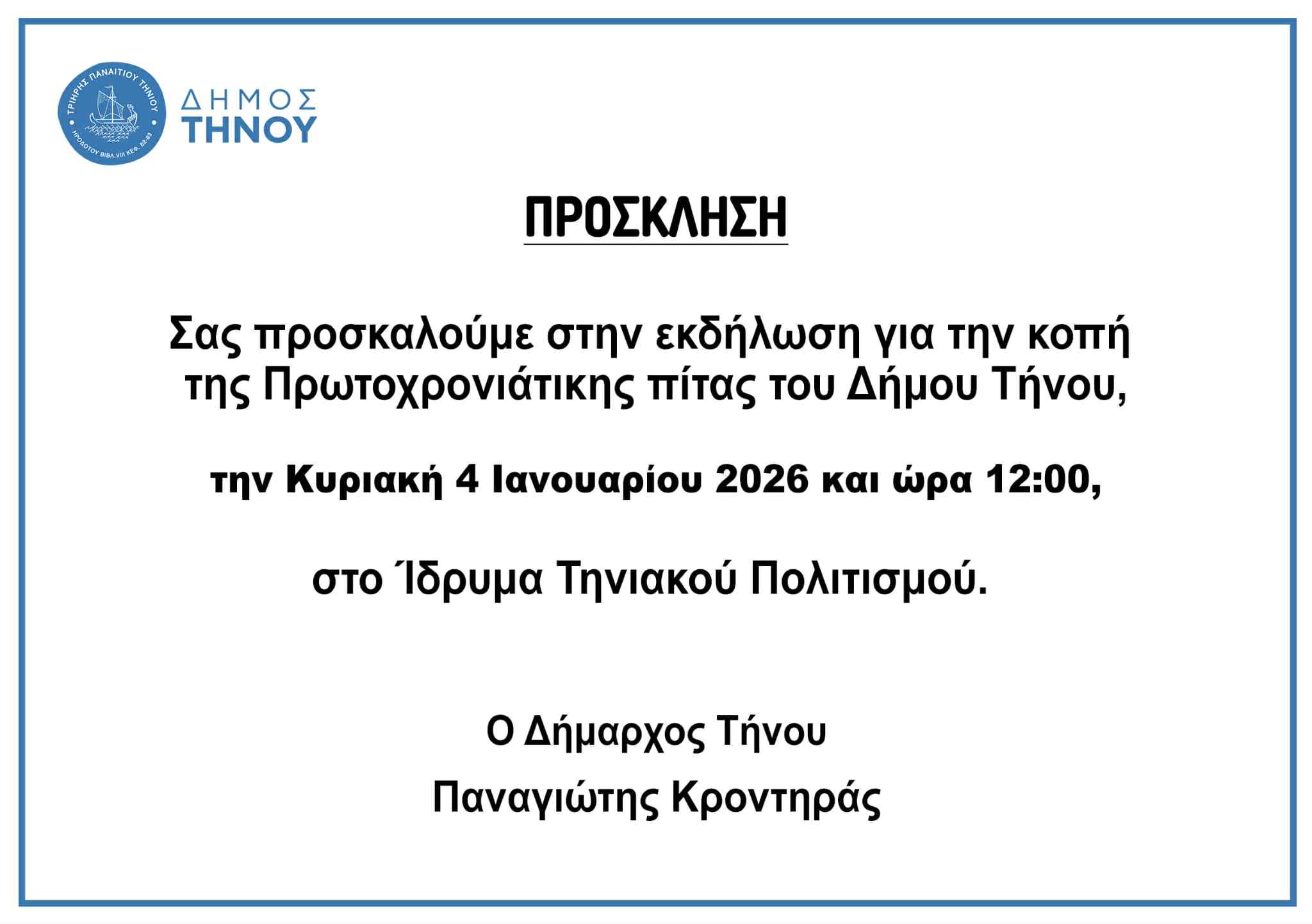 Σας προσκαλούμε στην εκδήλωση για την κοπή της Πρωτοχρονιάτικης πίτας του Δήμου Τήνου, την Κυριακή 4 Ιανουαρίου 2026 και ώρα 12:00, στο Ίδρυμα Τηνιακού Πολιτισμού.