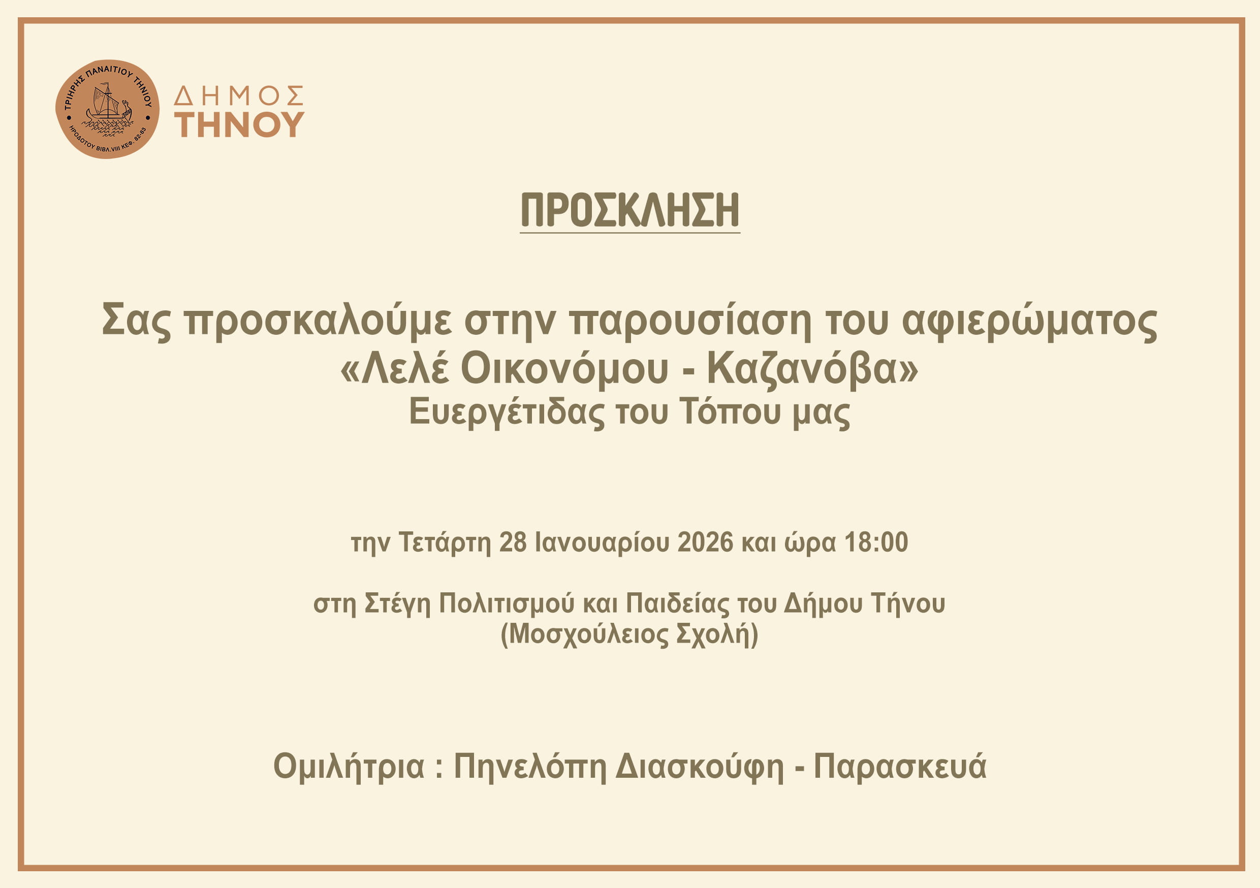 Ο Δήμος Τήνου σας προσκαλεί στην παρουσίαση του αφιερώματος στην Ευεργέτιδα του τόπου μας, Λελέ Οικονόμου – Καζανόβα, η οποία θα πραγματοποιηθεί την Τετάρτη 28 Ιανουαρίου και ώρα 18:00, στη Στέγη Πολιτισμού και Παιδείας του Δήμου Τήνου (Μοσχούλειος Σχολή).