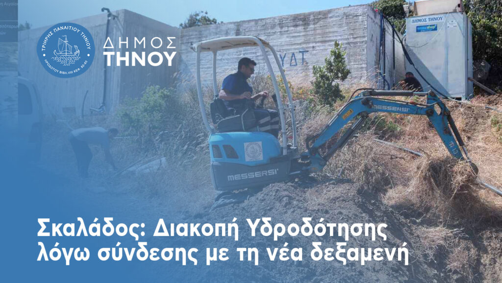 Η Υπηρεσία Ύδρευσης ενημερώνει τους κατοίκους του χωριού Σκαλάδος ότι σήμερα 16/06/2025 θα πραγματοποιηθεί διακοπή υδροδότησης από τις 11:00 π.μ. και έως την ολοκλήρωση των εργασιών, λόγω σύνδεσης του οικισμού με τη νέα δεξαμενή ύδρευσης.